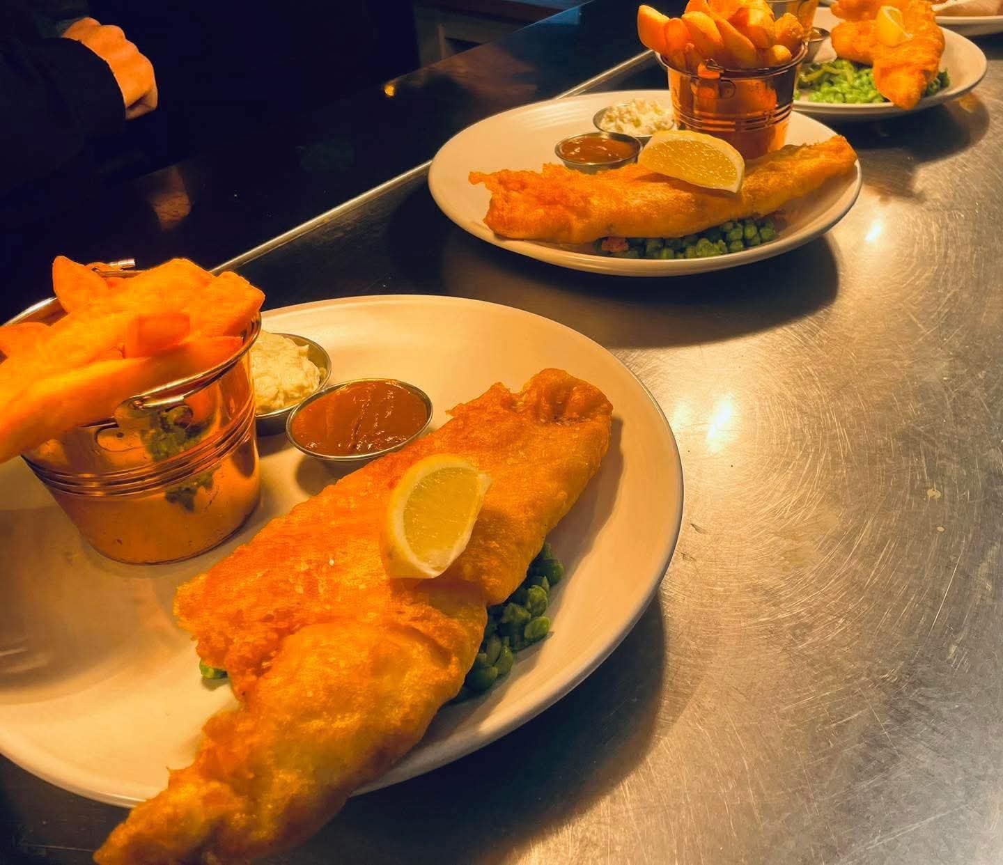 Every Friday lunch through April! OTW Fish and Chips, Triple cooked chips, crushed peas, fiver herb tartare and curry sauce. Only £17